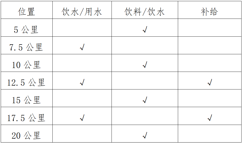 1.饮料、饮水/用水补给站:自起点起,每5公里设置一个饮料/饮水站,两个饮料/饮水站中间设置饮水/用水站;