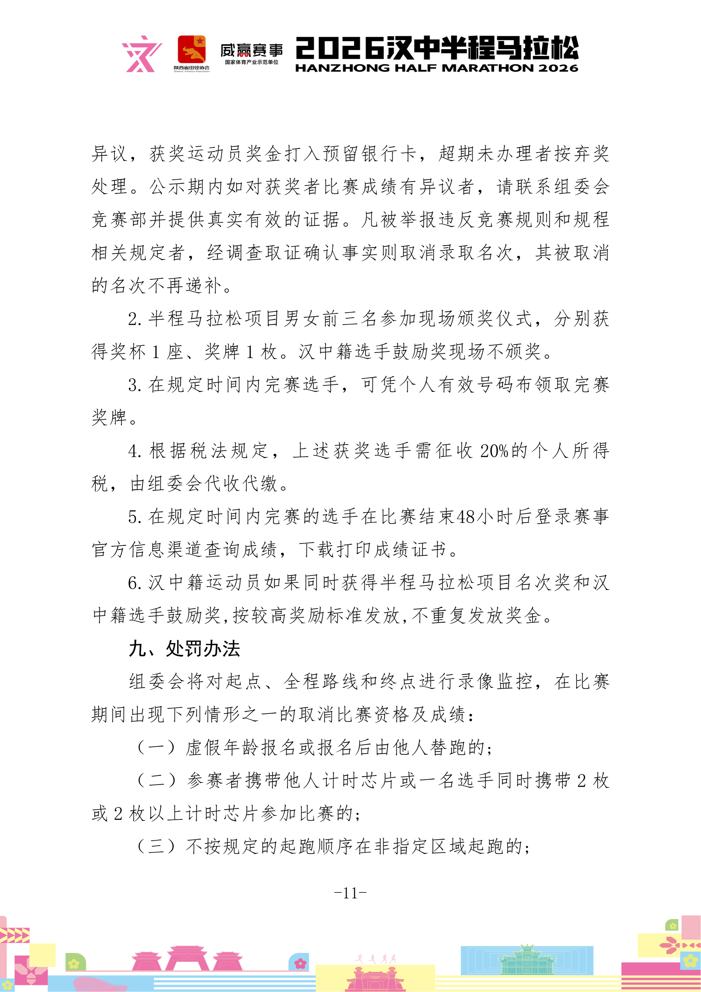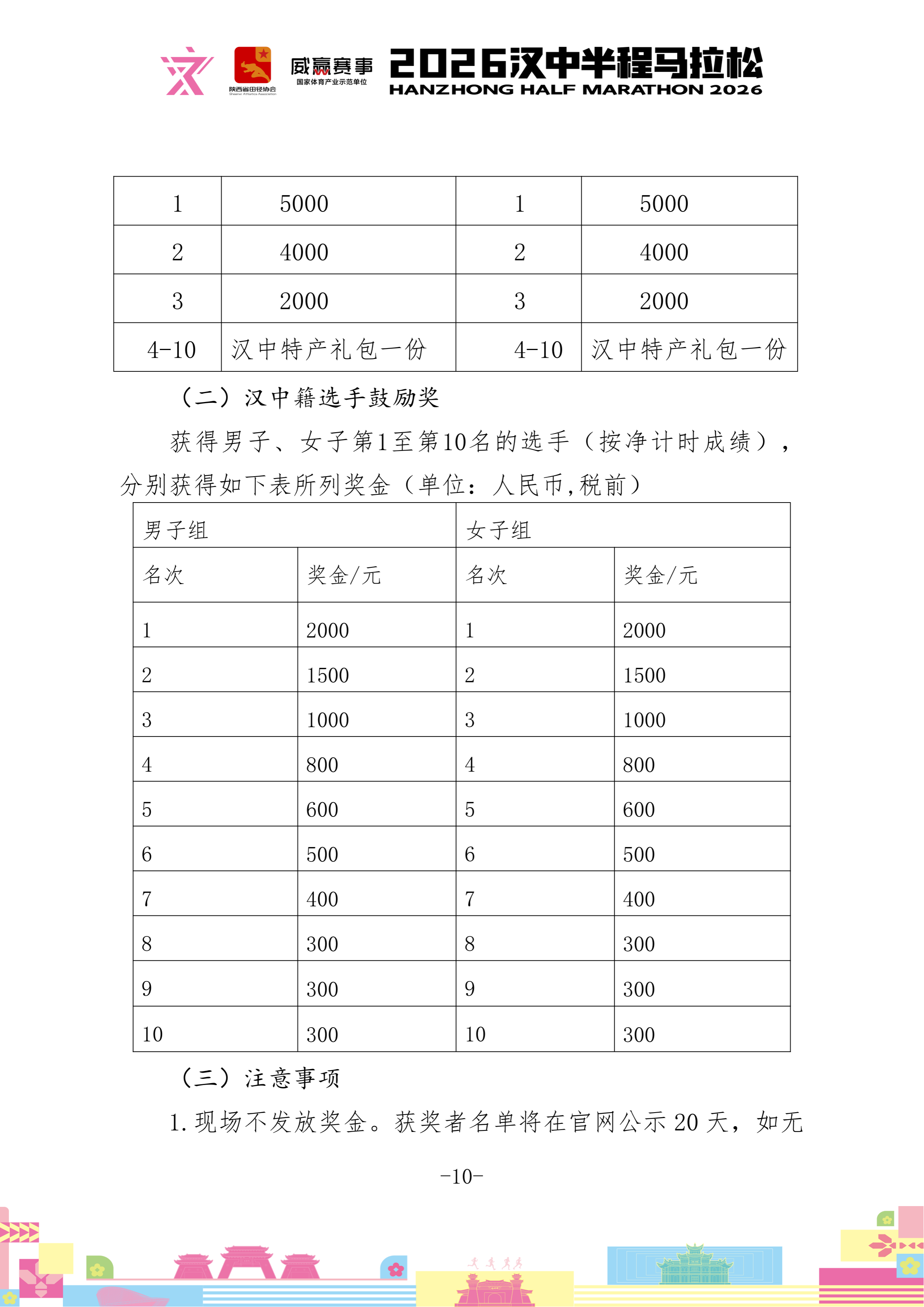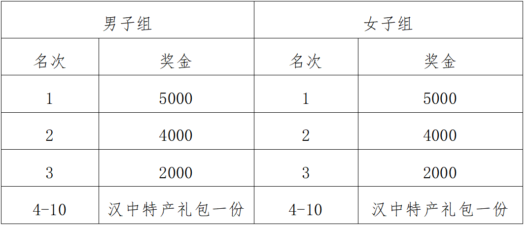 6.汉中籍运动员如果同时获得半程马拉松项目名次奖和汉中籍选手鼓励奖,按较高奖励标准发放,不重复发放奖金。