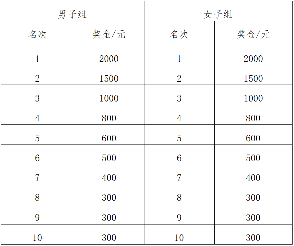 获得男子、女子第1至第10名的选手(按净计时成绩), 分别获得如下表所列奖金(单位:人民币,税前)