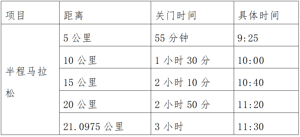 为了保证参赛选手比赛安全、顺利,比赛期间比赛路线各段设关门时间,限时对社会交通封闭。关门时间后,相应路段恢复社会交通。参赛选手在规定的关门时间内,未跑完对应的距离请立即停止比赛,退出赛道,以免发生危险。退出比赛的选手可乘坐组委会提供的收容车到相应项目的终点处。关门时间见下表(以发令枪声时间为准):