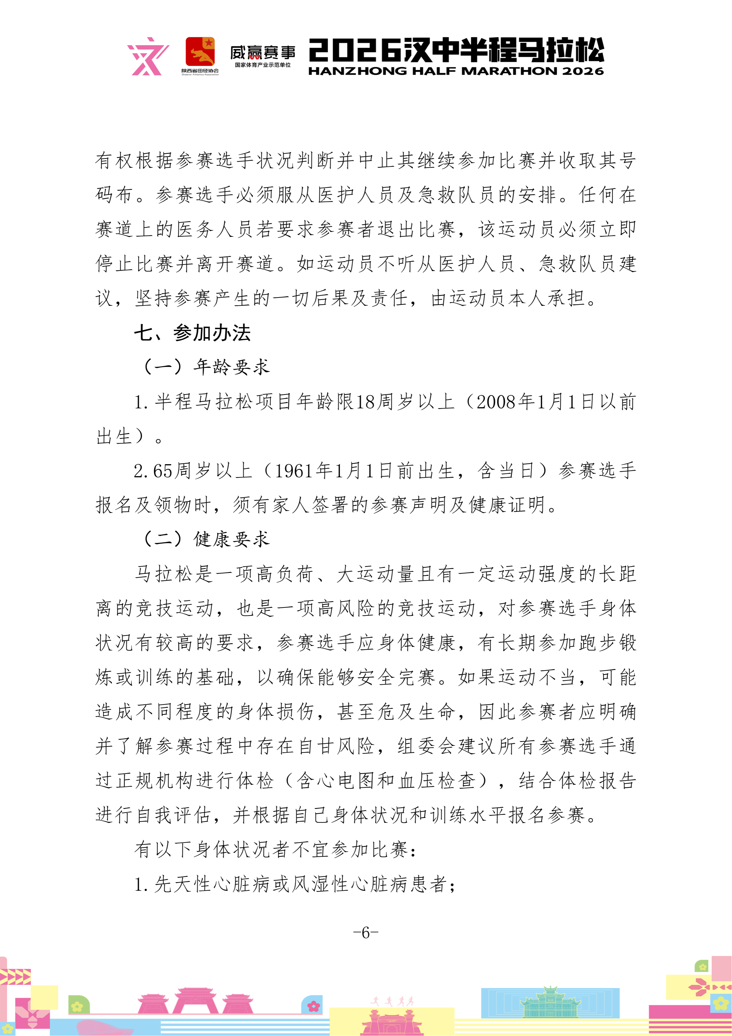 2.65周岁以上(1961年1月1日前出生,含当日)参赛选手报名及领物时,须有家人签署的参赛声明及健康证明。