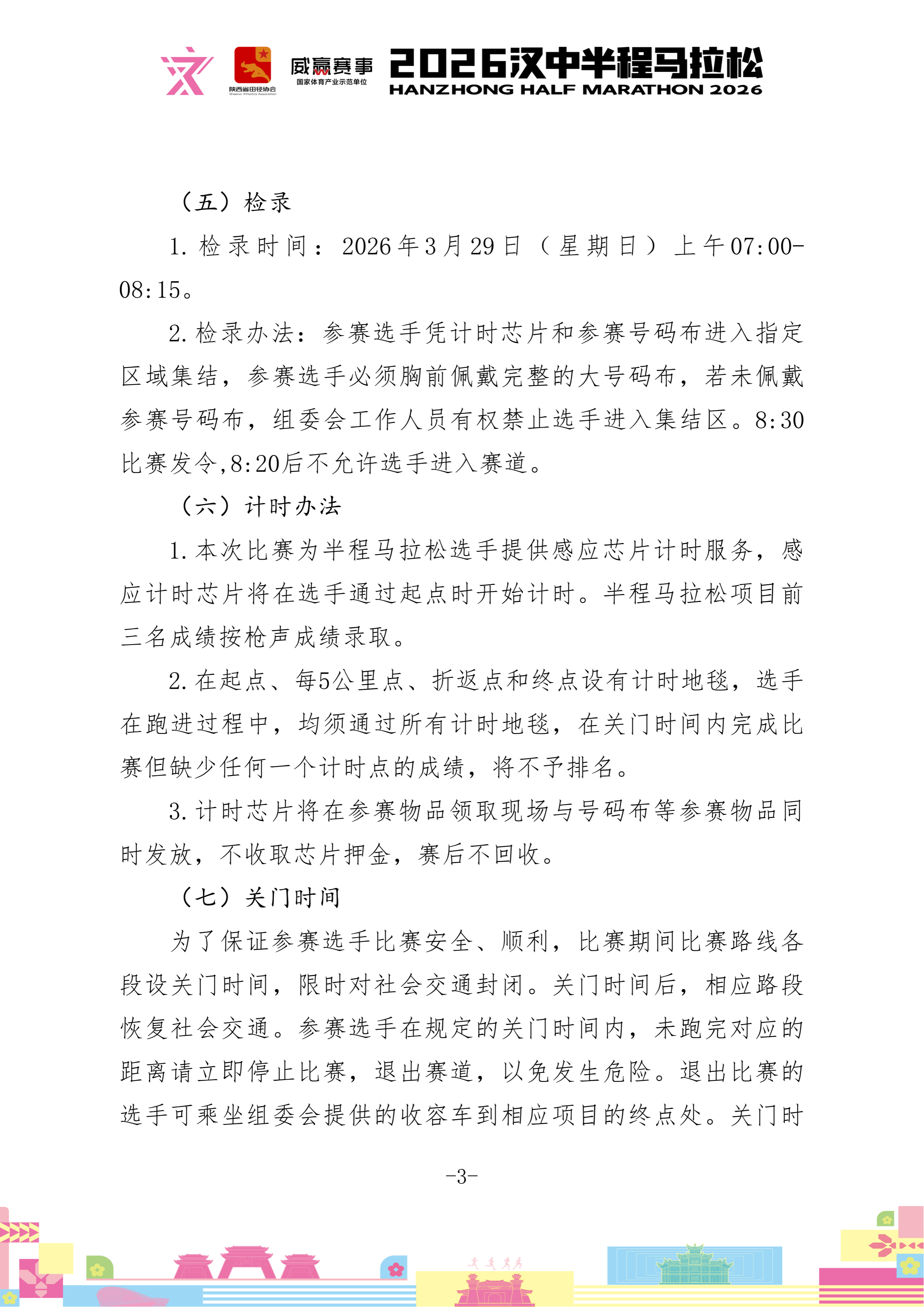1.检录时间:2026年3月29日(星期日)上午07:00-08:15。