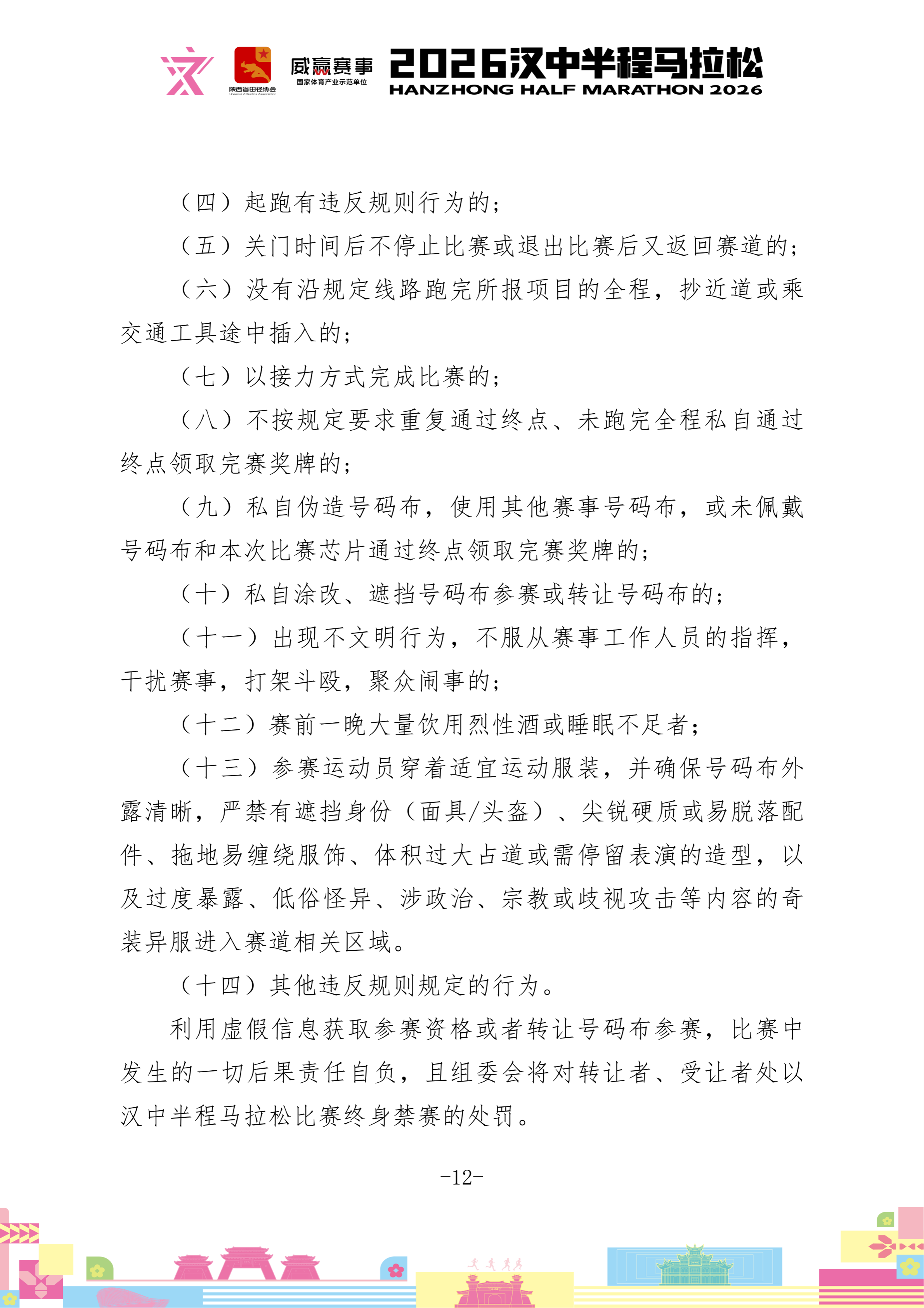 利用虚假信息获取参赛资格或者转让号码布参赛,比赛中发生的一切后果责任自负,且组委会将对转让者、受让者处以汉中半程马拉松比赛终身禁赛的处罚。
