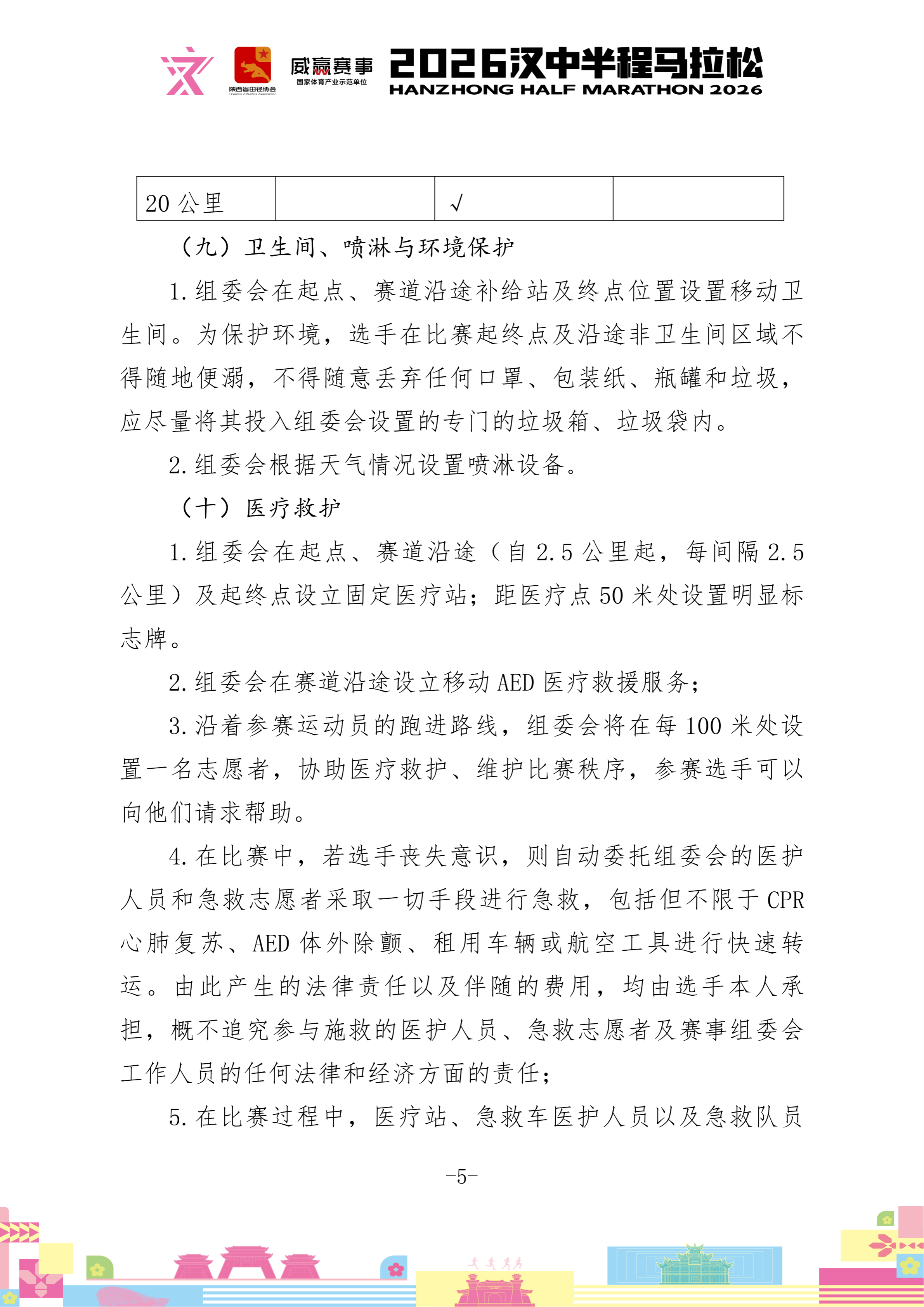 5.在比赛过程中,医疗站、急救车医护人员以及急救队员有权根据参赛选手状况判断并中止其继续参加比赛并收取其号码布。参赛选手必须服从医护人员及急救队员的安排。任何在赛道上的医务人员若要求参赛者退出比赛,该运动员必须立即停止比赛并离开赛道。如运动员不听从医护人员、急救队员建议,坚持参赛产生的一切后果及责任,由运动员本人承担。