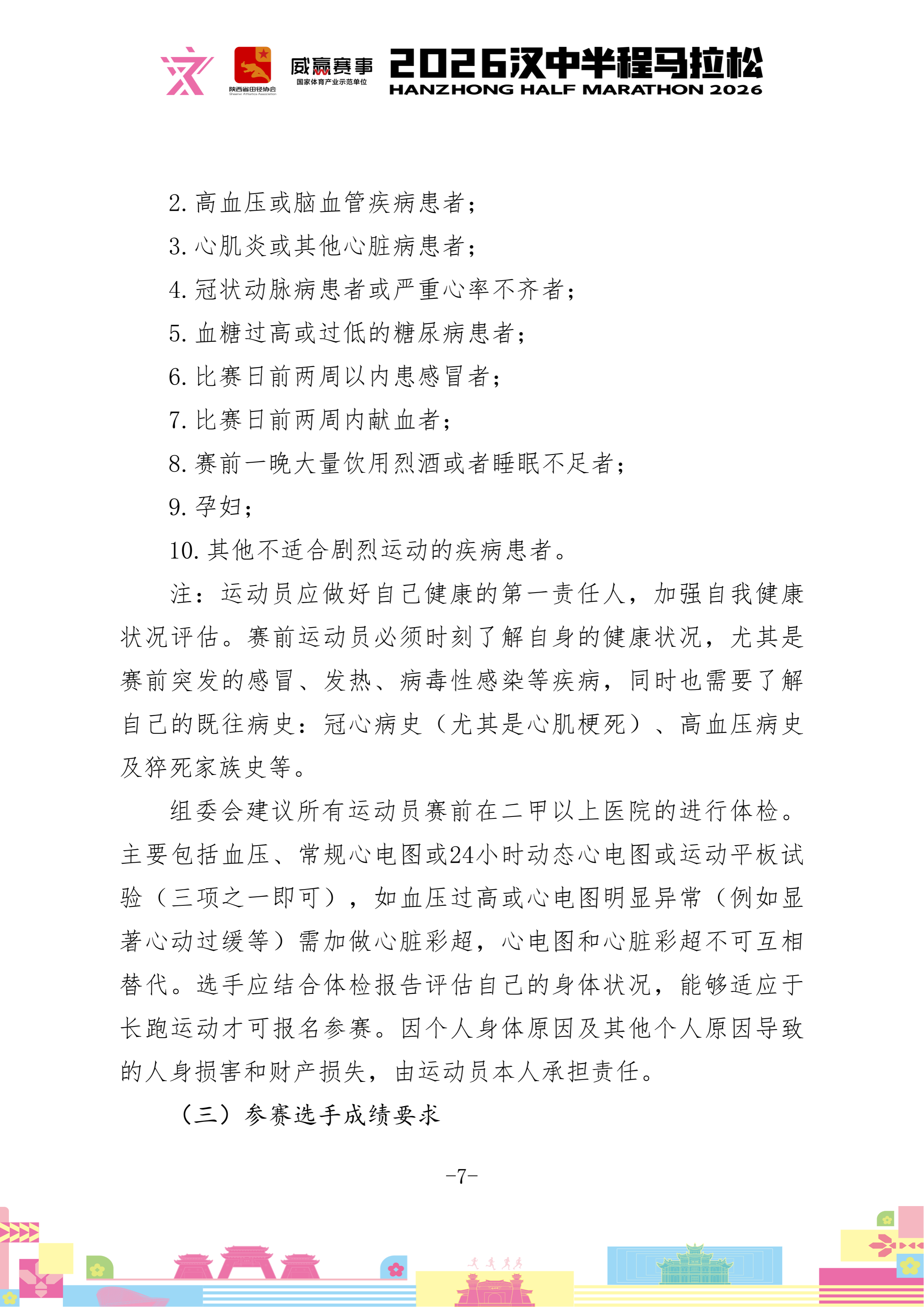 马拉松是一项高负荷、大运动量且有一定运动强度的长距离的竞技运动,也是一项高风险的竞技运动,对参赛选手身体状况有较高的要求,参赛选手应身体健康,有长期参加跑步锻炼或训练的基础,以确保能够安全完赛。如果运动不当,可能造成不同程度的身体损伤,甚至危及生命,因此参赛者应明确并了解参赛过程中存在自甘风险,组委会建议所有参赛选手通过正规机构进行体检(含心电图和血压检查),结合体检报告进行自我评估,并根据自己身体状况和训练水平报名参赛。
