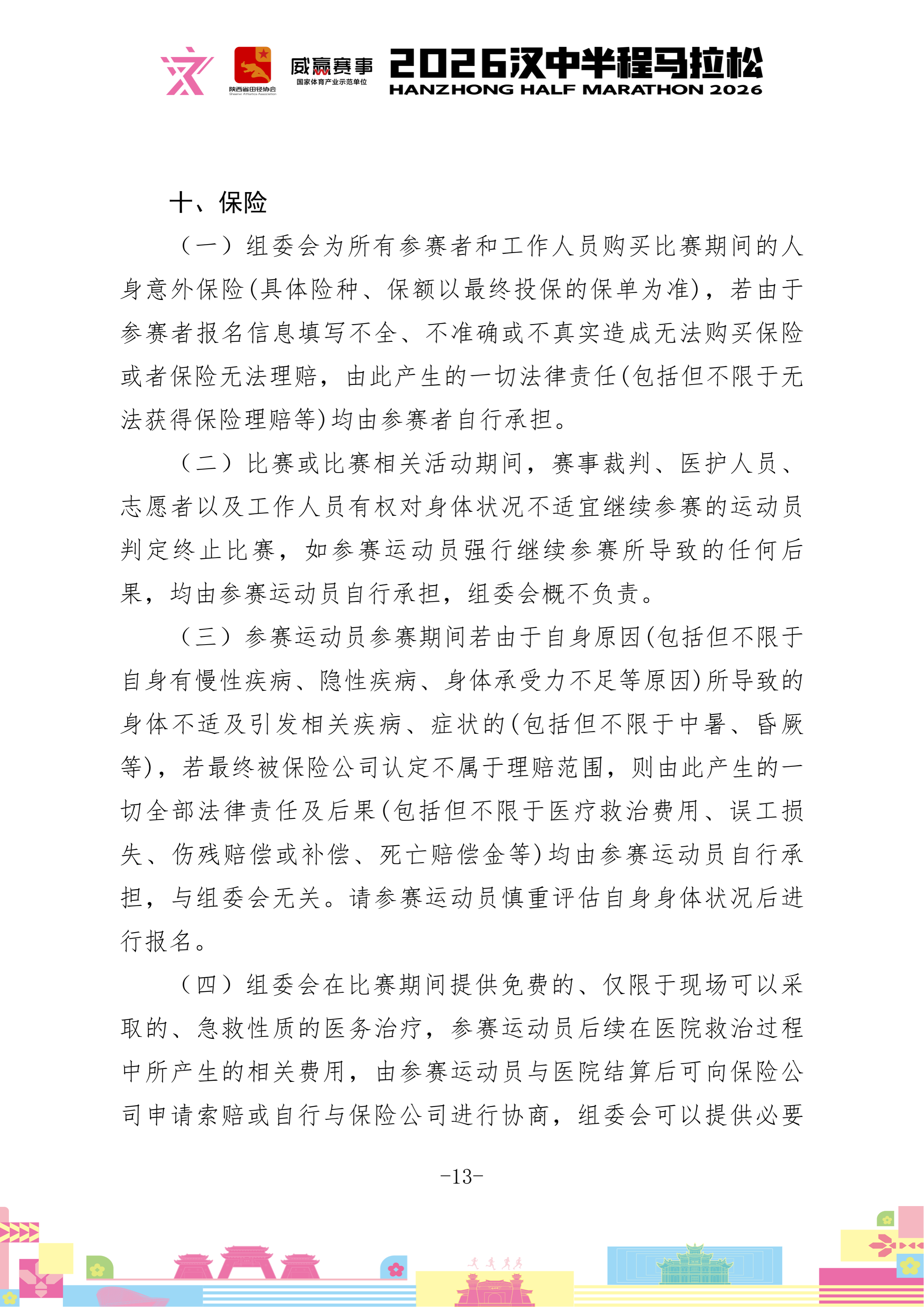 (三)参赛运动员参赛期间若由于自身原因(包括但不限于自身有慢性疾病、隐性疾病、身体承受力不足等原因)所导致的身体不适及引发相关疾病、症状的(包括但不限于中暑、昏厥等),若最终被保险公司认定不属于理赔范围,则由此产生的一切全部法律责任及后果(包括但不限于医疗救治费用、误工损失、伤残赔偿或补偿、死亡赔偿金等)均由参赛运动员自行承担,与组委会无关。请参赛运动员慎重评估自身身体状况后进行报名。