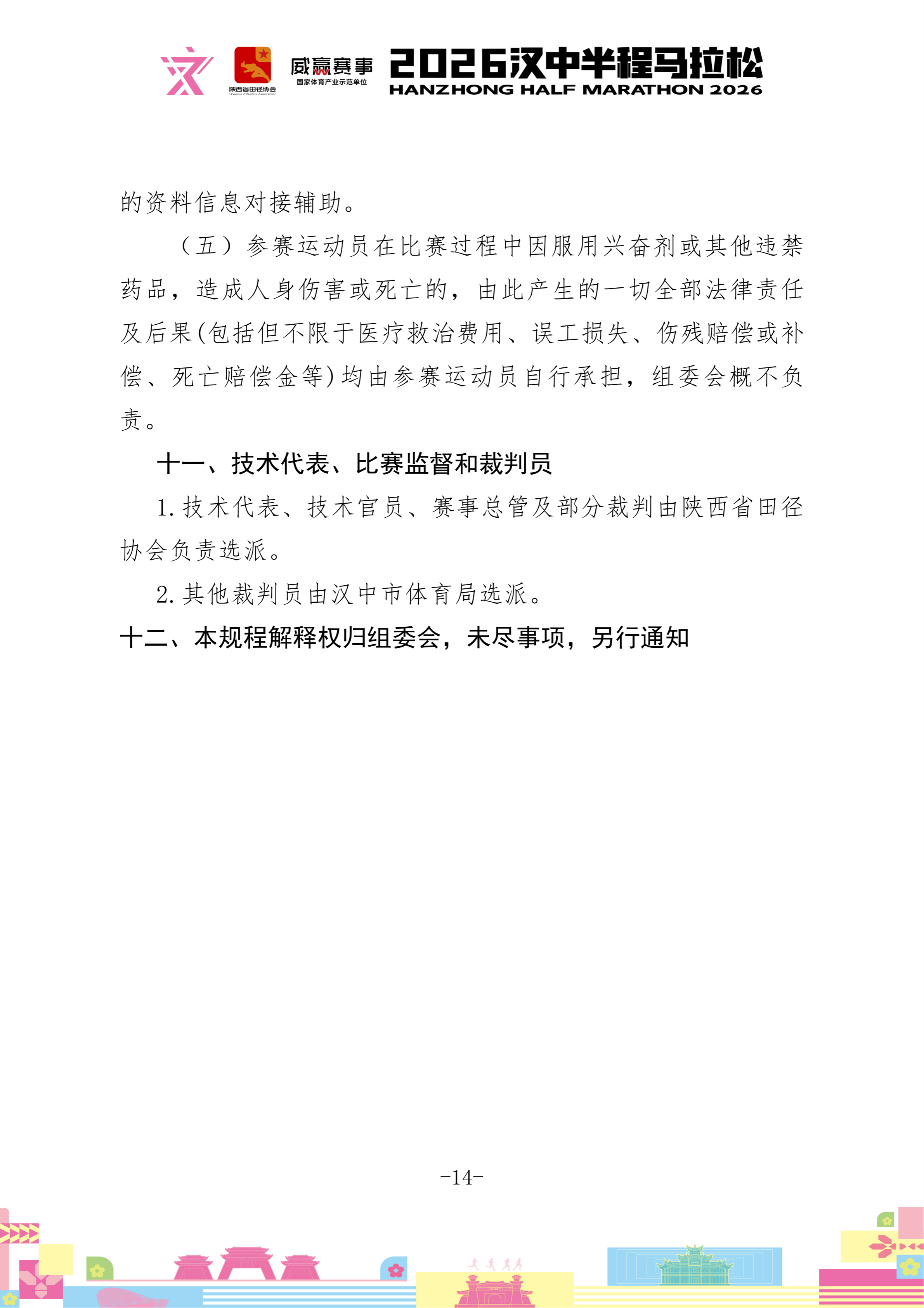 (五)参赛运动员在比赛过程中因服用兴奋剂或其他违禁药品,造成人身伤害或死亡的,由此产生的一切全部法律责任及后果(包括但不限于医疗救治费用、误工损失、伤残赔偿或补偿、死亡赔偿金等)均由参赛运动员自行承担,组委会概不负责。
