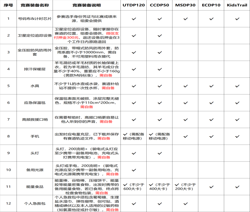组委会将发布本届赛事要求的竞赛装备与建议装备清单,所有参赛选手必须全程携带本组别竞赛装备,组委会将在赛道检查站对选手竞赛装备进行检查或抽查,一旦发现选手缺失竞赛装备的,将严格按照本竞赛规程处以终止比赛、取消成绩的出发,各组别竞赛装备清单如下:
