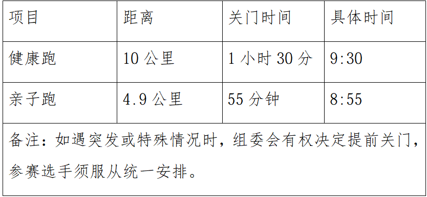 关门距离和时间(以08:00发令时间为准)具体见下表: