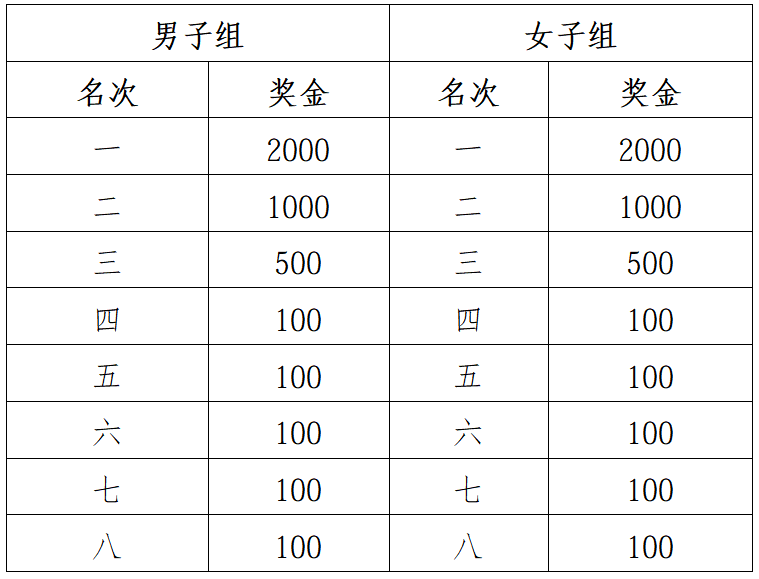 男、女分别录取前8名(前8名选手以枪声计时有效成绩录取),分别获得奖金,见下表(单位:人民币/元)。