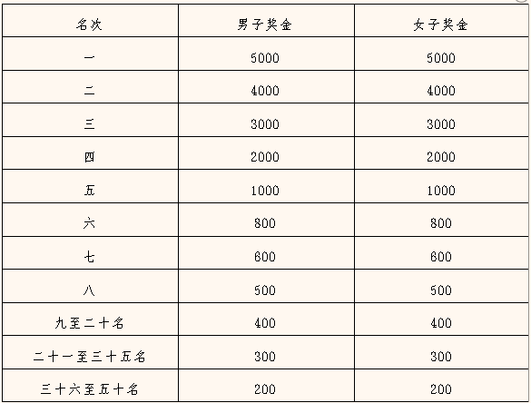 半程马拉松录取前五十名发放奖金,男、女前八名按枪声成绩录取,且奖金按枪声成绩对应发放,其他获奖参赛选手奖金按净成绩排名对应发放。名次奖具体如下表(单位:人民币)