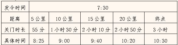 为保证参赛选手安全、顺利比赛,比赛期间各路段设关门时间,限时对社会交通封闭。关门时间后,相应路段恢复社会交通。参赛选手未在规定的关门时间跑完对应的距离请立即停止比赛,退出赛道,以免发生危险。退出比赛的选手可乘坐组委会提供的收容车到终点处。关门距离和时间见下表:(以发令枪声时间为准)