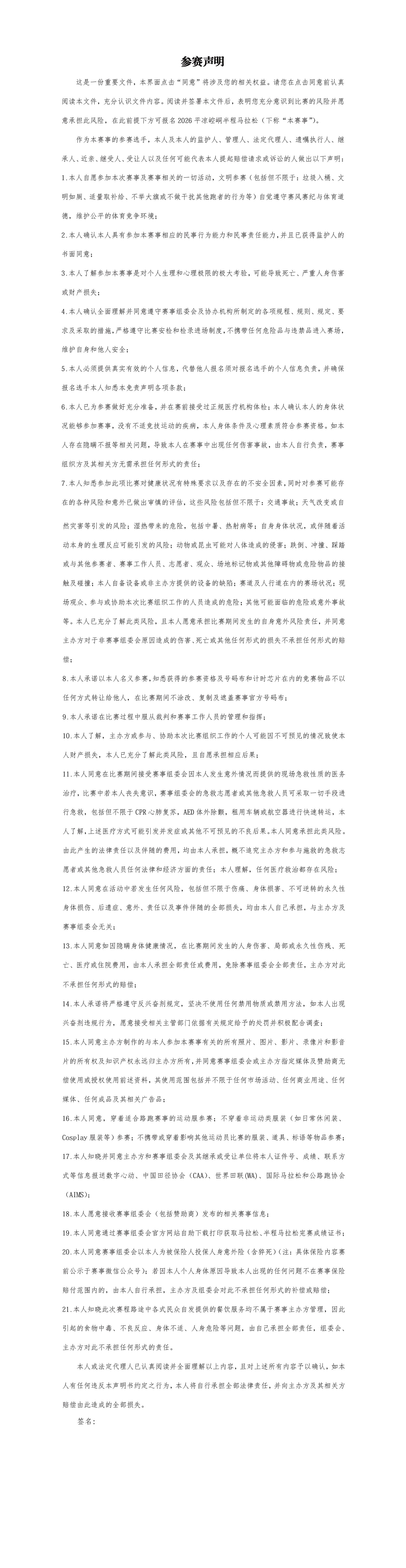 1.参赛选手必须符合年龄要求及身体状况要求方能报名参赛,若有提供虚假参赛经历,谎报年龄、身份信息或隐瞒不宜参赛疾病及其他不宜参赛的个人情况骗取参赛资格的,一旦被组委会发现或者调查核实,即刻取消参赛资格,任何意外风险或安全事故后果均由参赛选手本人或其法定代理人自负,组委会不予承担任何法律责任。参赛包一经领取,将被视为知晓并同意上述内容。在比赛中因个人身体及其他个人原因导致的人身损害和财产损失,由参赛选手本人承担责任;