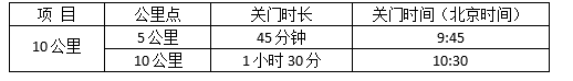 为保证选手比赛安全和城市道路交通秩序,各公里点关门后,相应公里点计时地毯即停止工作,相应路段将解除交通管制并恢复社会交通。在规定的关门时间内,未跑到相应公里点的选手须立刻停止比赛,退出赛道,以免发生危险。退出赛道的选手可就近及时搭乘收容车抵达终点,也可自行选择其他方式到达相应比赛终点取包或自行离开。否则由此引发的事故将由该名选手自行承担相应法律责任和赔偿责任。