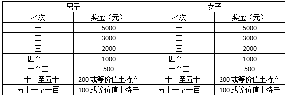 1.男、女前三名以枪声成绩进行排名;四至一百名以净成绩进行排名,分别获得下表所列的奖金/或等价值礼品(单位:人民币/元)。