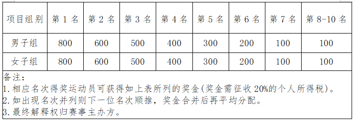 录取前十名颁发奖金、证书。其余运动员完成比赛后颁发完赛奖牌。