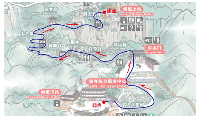 天竺山游客服务中心广场(起点)-天竺山景区(东山门),途径徒步道至山顶索道上站(终点)。