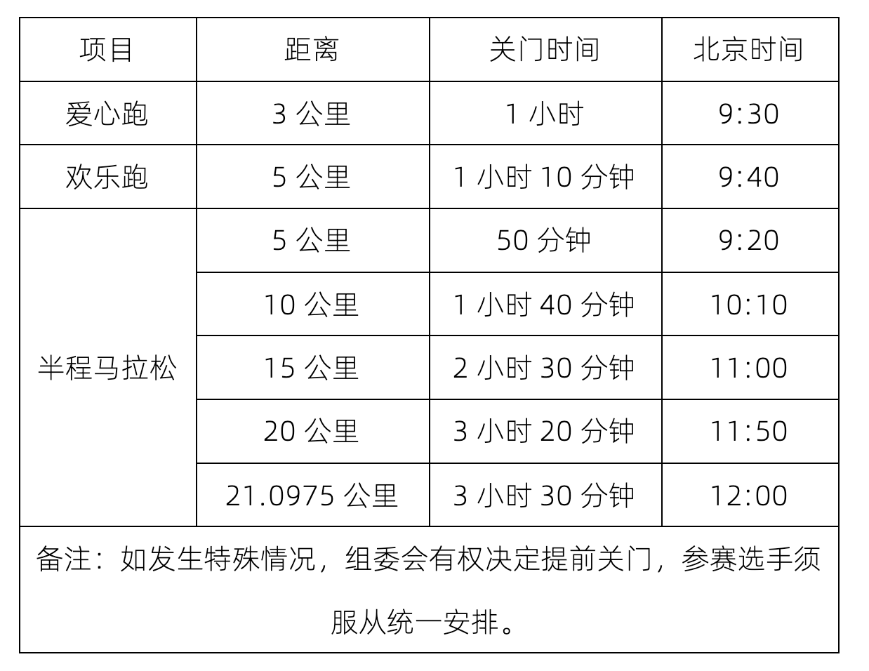 起跑顺序按半程马拉松运动员、欢乐跑、爱心跑运动员的先后顺序排列,各项目方阵间隔10米。