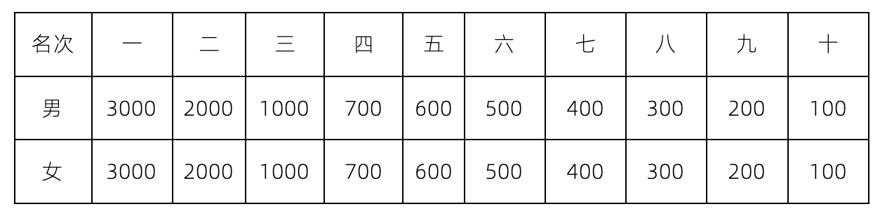 奖励男、女前10名选手,男、女前三名选手按枪声成绩进行排名,其他排名按净计时成绩进行排名并分别获得奖金(见表):