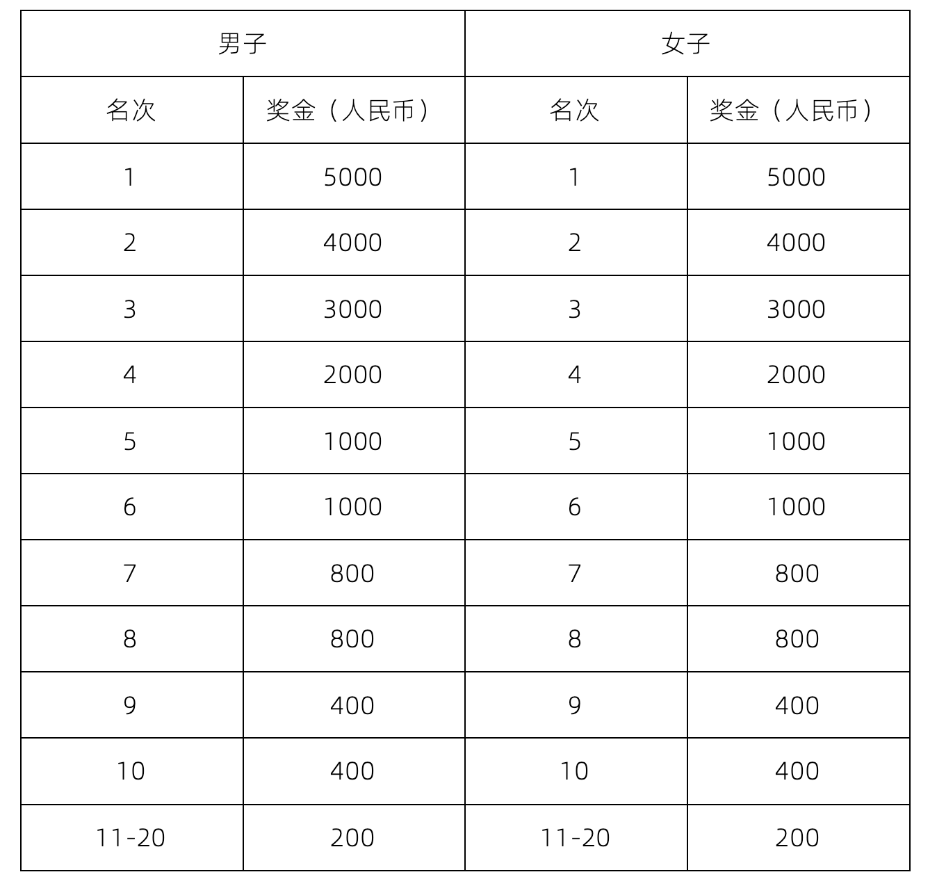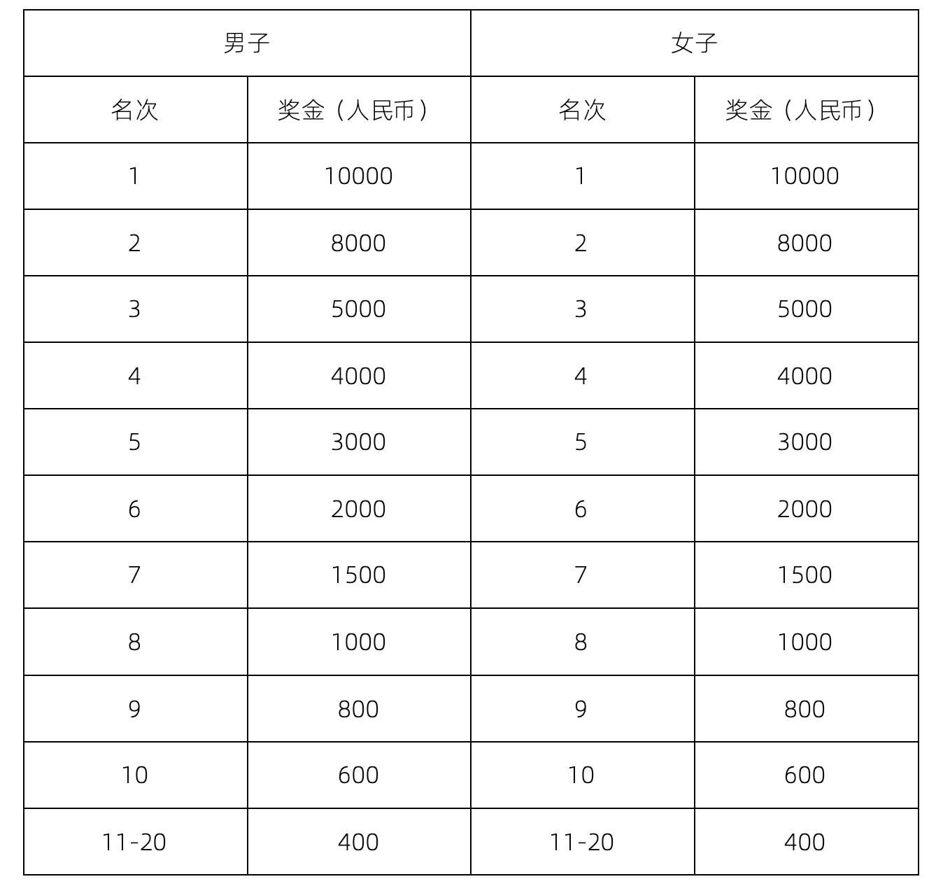 1.本次比赛马拉松项目录取男子、女子组前20名。其中1-3名按照枪声成绩录取,4-20名按照净计时成绩录取。 2.名奖励对象:所有正常报名及完赛的马拉松项目参赛选手。奖金设置(人民币,税前):