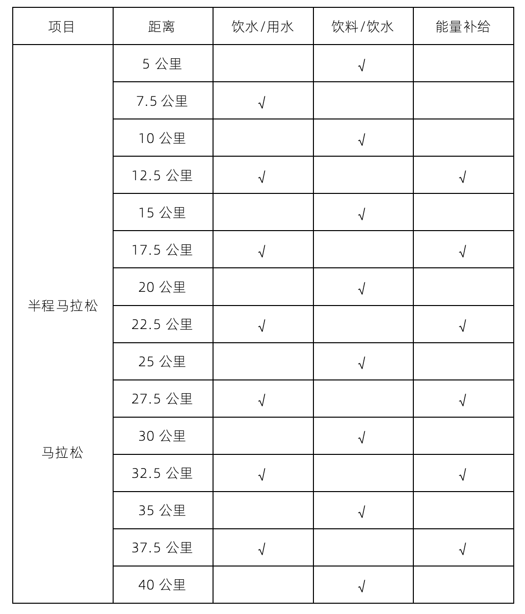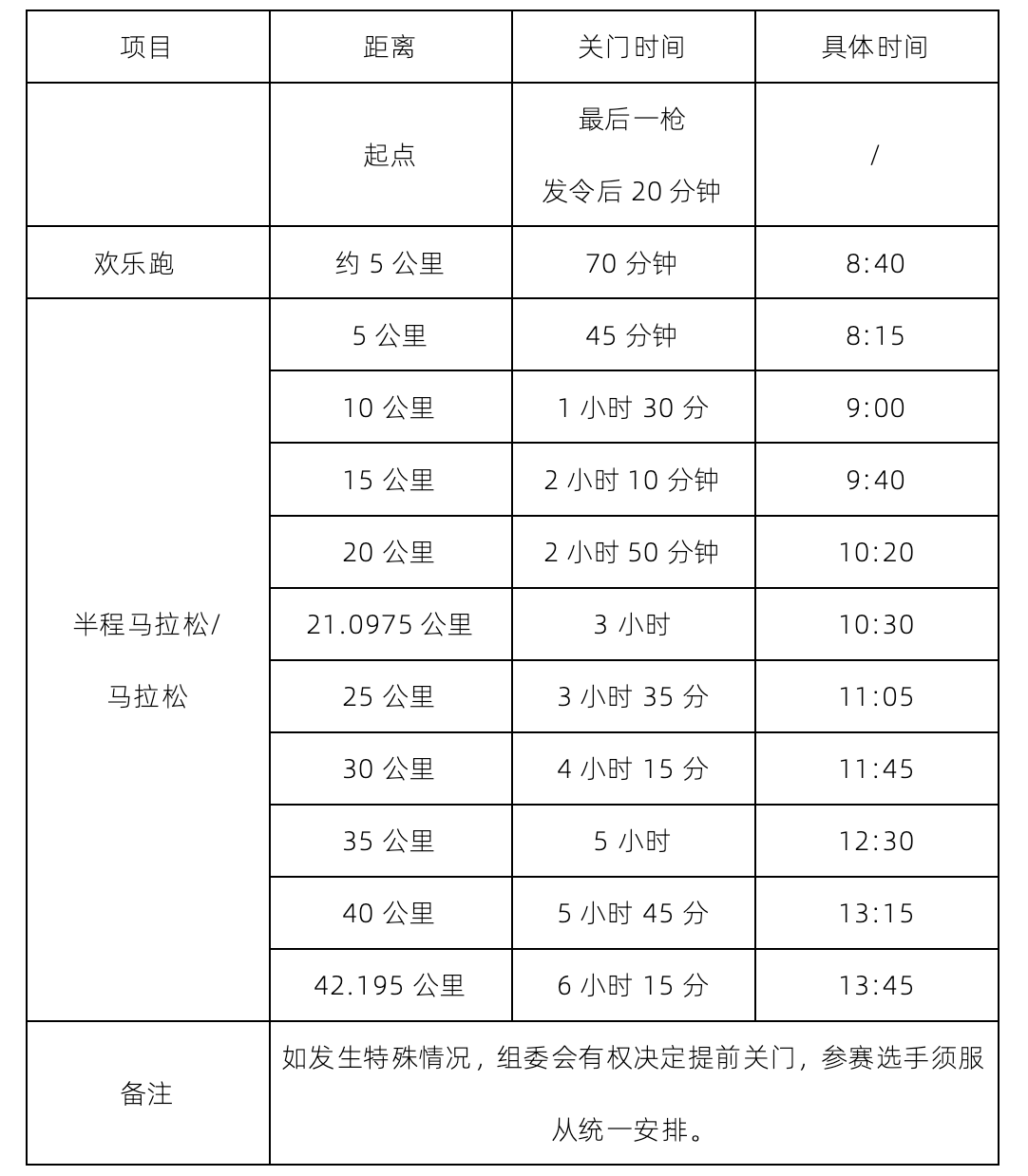 各项目关门时间见下表(以鸣枪出发时间计算):