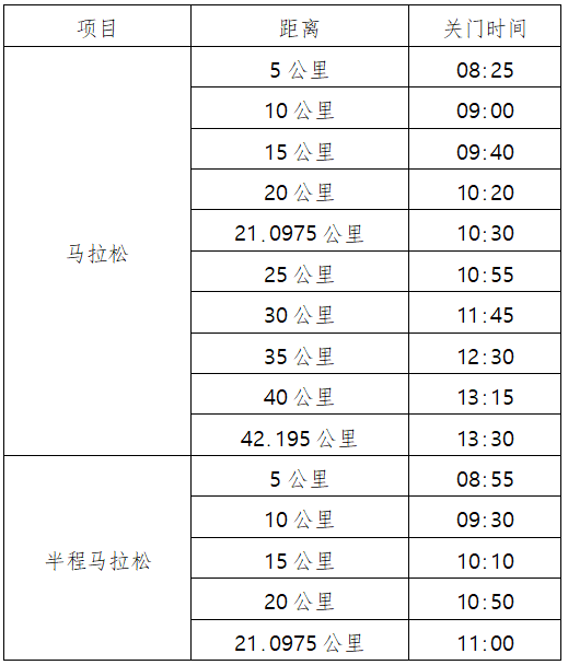 为了保证参赛选手比赛安全、顺利,比赛期间比赛路线各段设关门时间,限时对道路交通滚动封闭。参赛选手在规定的关门时间内未完成对应的比赛距离,应立即停止比赛并退出赛道;退出比赛的选手可乘坐组委会提供的援助车返回终点处或自行离开。