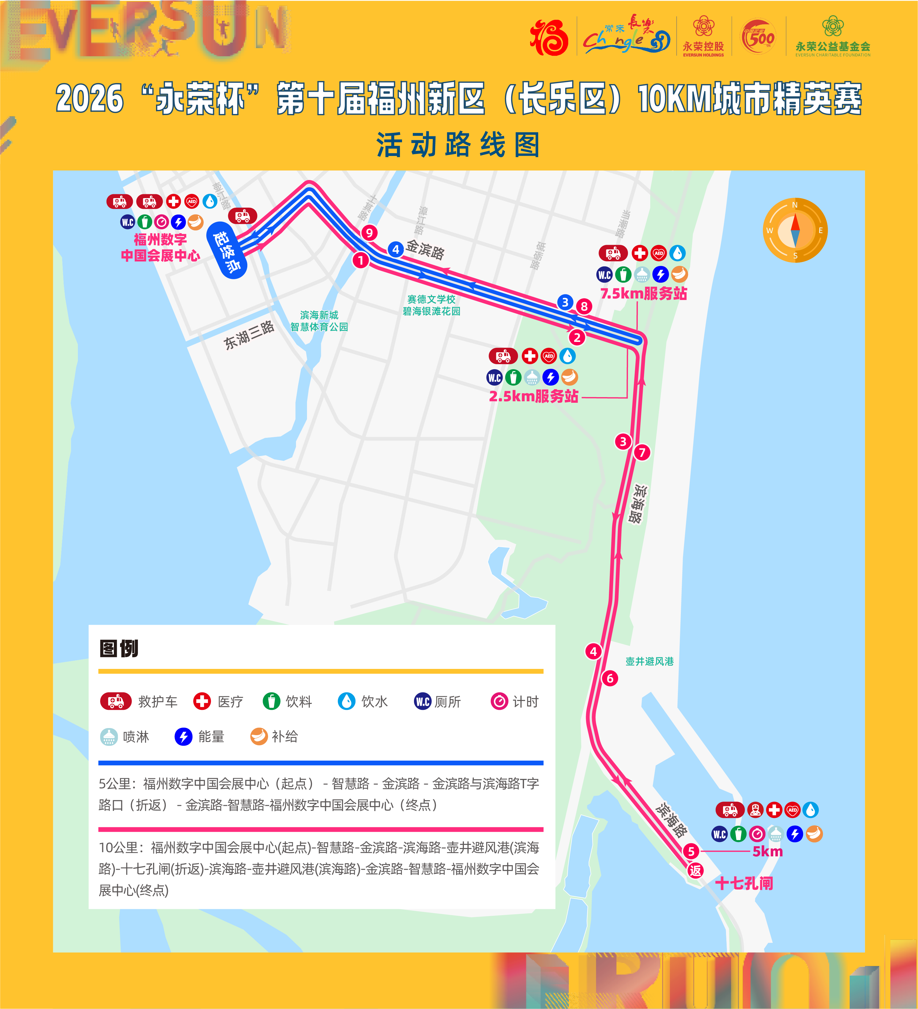 (1)10公里组:福州数字中国会展中心(起点)-智慧路-金滨路-滨海路-壶井避风港(滨海路)-十七孔闸(折返)-滨海路-壶井避风港(滨海路)-金滨路-智慧路-福州数字中国会展中心(终点)